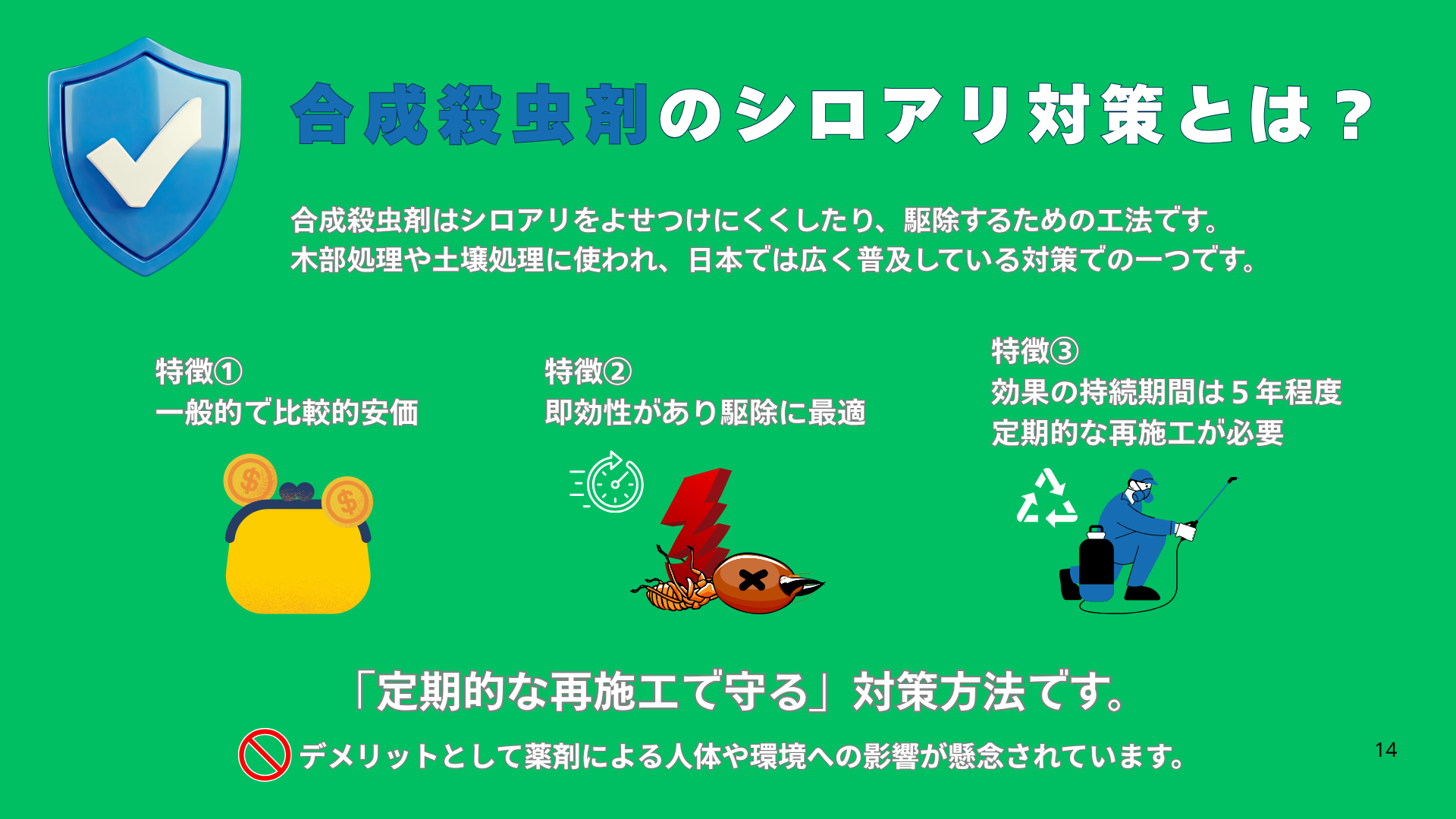 「小さなお子さまやペットのいるご家庭にこそ安心して選んでいただきたいシロアリ対策。それが自然素材ホウ酸による処理です。揮発性がなく、室内に薬剤の臭いや成分が広がらないため、日常生活への影響がほとんどありません。安全性と持続効果を兼ね備え再処理の煩わしさのない安心のシロアリ対策です。