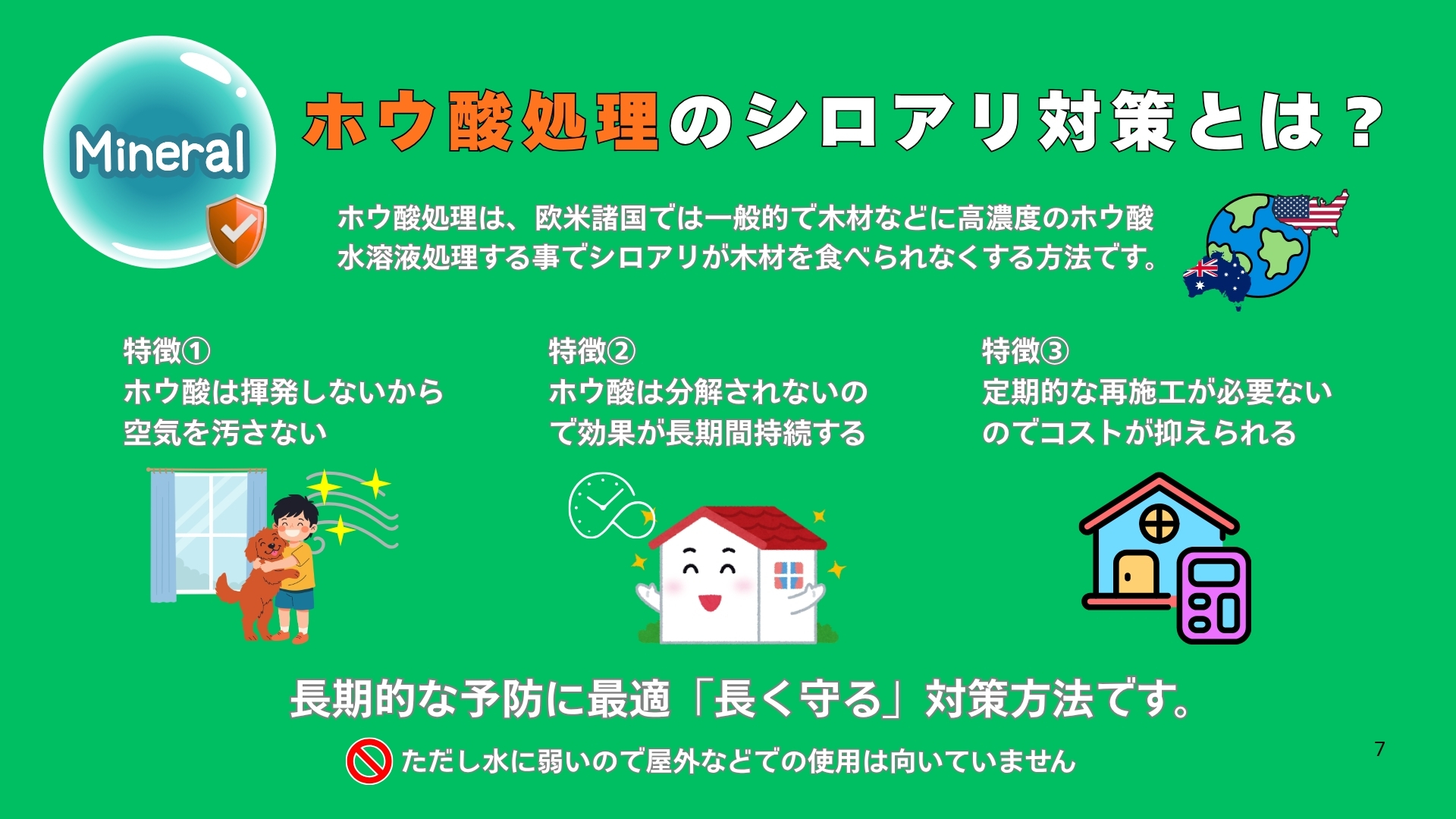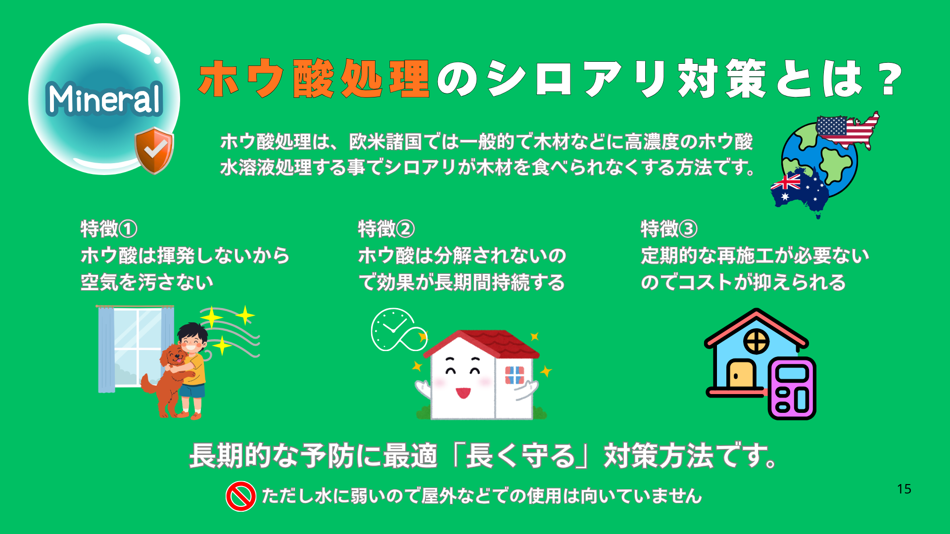 一般社団法人日本ホウ酸処理協会が全国展開しているホウ酸を使用した木造住宅の防腐防蟻対策です。