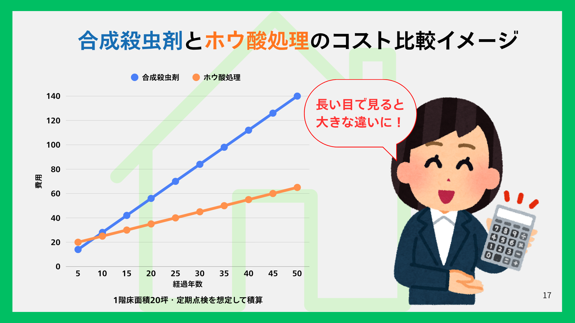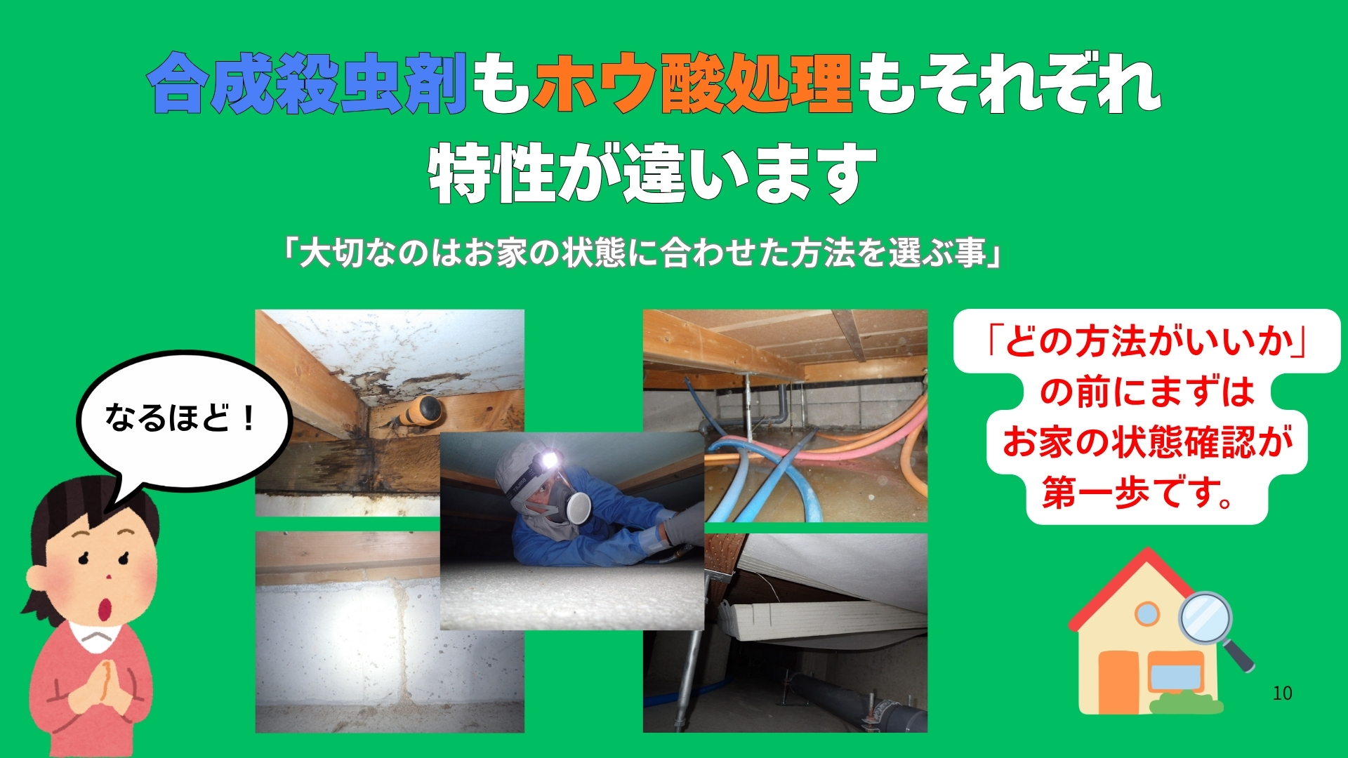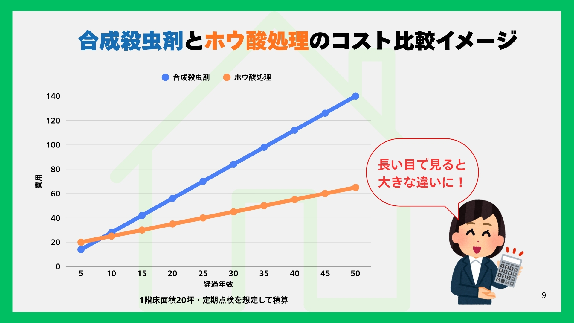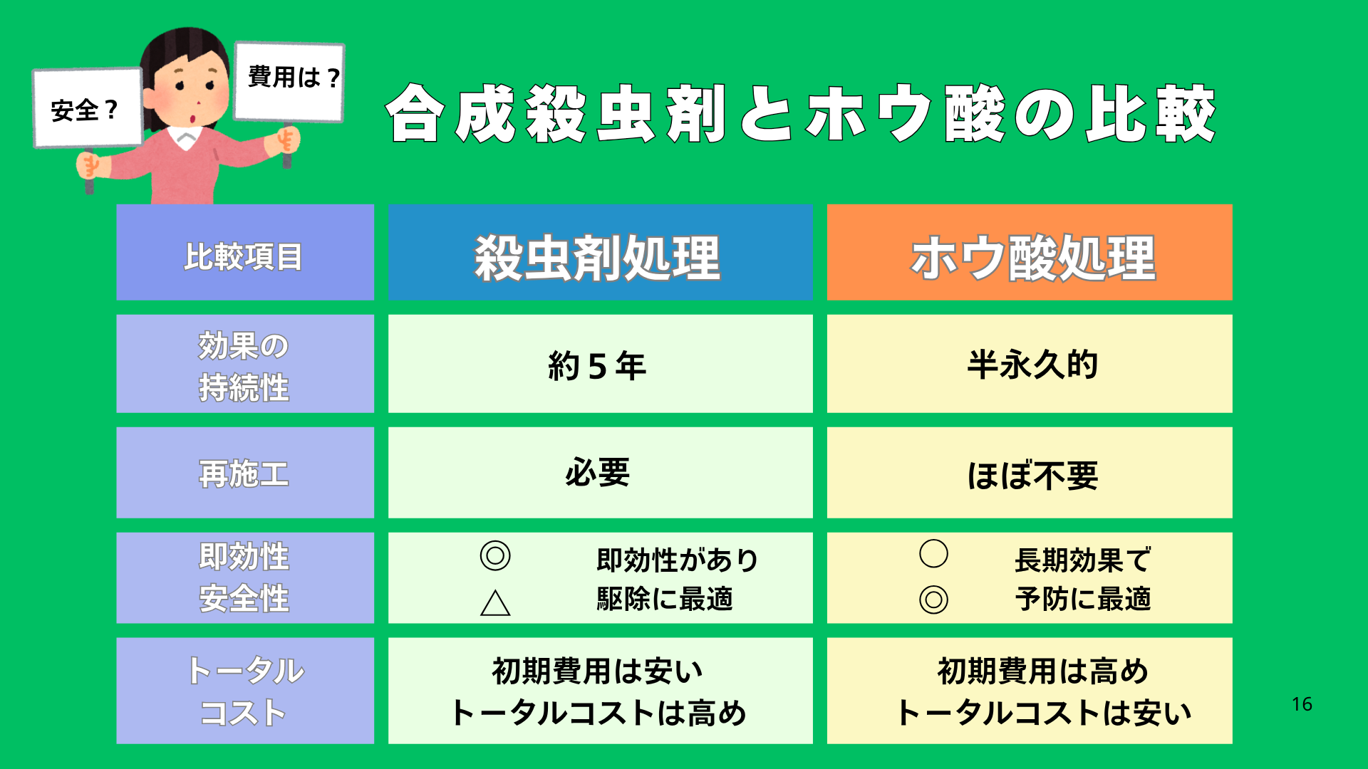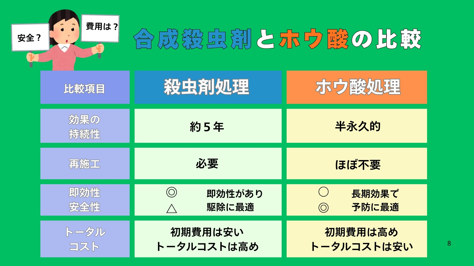 メーカーや大手のように複数の業者を経由しない自社プランだから、中間コストがかからず、高品質なホウ酸処理を安心価格でご提供できます。